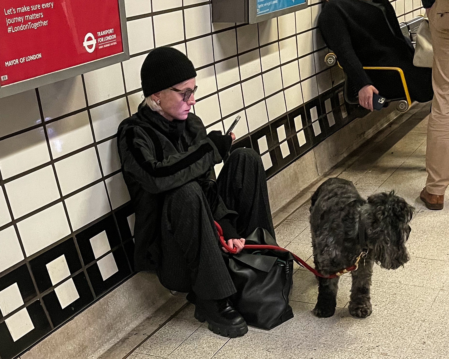 | Home > Out & About > 2022 > December 11 | Seen sitting at Leicester Square Tube Station with her dog Spencer in London, United Kingdom |